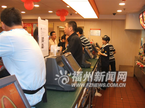 曾先生一行5人到福州東街東百商場(chǎng)地下室麥當(dāng)勞餐廳吃快餐,因叫的餐和送的餐不一樣,與服務(wù)員理論時(shí)被罵不會(huì)講普通話,他們便坐上售貨柜臺(tái)討說(shuō)法。