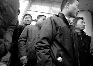 昨日中午12點30分左右,鵬潤大廈總部門口,百余名工人站在寒風中。