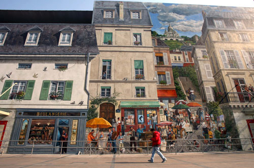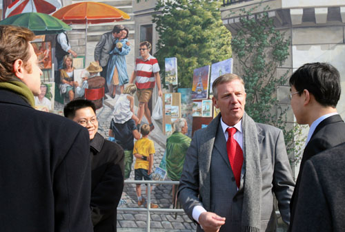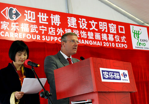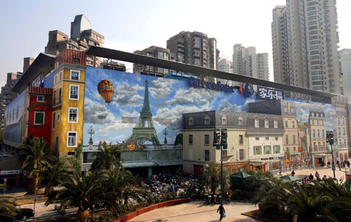 1月16日,普陀區(qū)“迎世博 建設(shè)文明窗口——家樂福武寧店外墻裝飾壁畫揭幕儀式”隆重舉行,家樂福武寧店外墻的巨幅人工裝飾壁畫正式亮相。巨幅壁畫由法國著名的Cite Creation公司設(shè)計(jì),壁畫面積達(dá)5000平方米,由多名中外藝術(shù)家手繪而成,已獲得“迎世博特別項(xiàng)目”獎(jiǎng),并正在申請(qǐng)“世界上最大的人工仿真壁畫”吉尼斯世界紀(jì)錄。