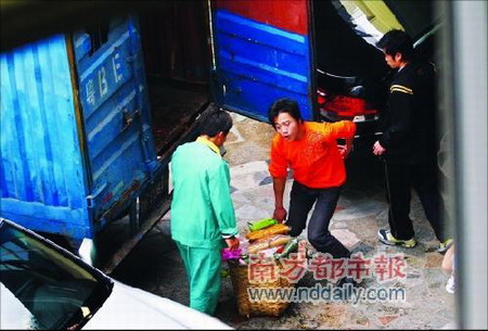 麥德龍超市深圳南山店中已經(jīng)下架、報損和過期的食品等,竟然通過非正常渠道流往了市場和餐桌。圖為參與運輸?shù)娜藛T正在卸貨。