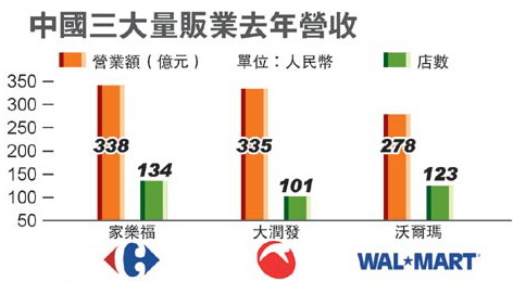 中國連鎖經(jīng)營協(xié)會公布2008年中國連鎖百強,大潤發(fā)緊追家樂福,雙方開店數(shù)雖有33家差距,但大潤發(fā)營收僅比家樂福少人民幣3億元,兩大通路在營業(yè)額規(guī)模差距已漸縮短,若大潤發(fā)今年照計劃再增25家店,營收有機會超過家樂福。