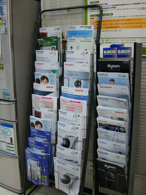 回到電器銷售區(qū)域,與國(guó)內(nèi)家電連鎖企業(yè)的賣場(chǎng)相同的是,宣傳單頁(yè)是消費(fèi)者掌握產(chǎn)品功能及特點(diǎn)的最重要的產(chǎn)品信息來(lái)源之一,各種參數(shù)在這些宣傳單頁(yè)上一應(yīng)俱全,只不過(guò)它們被固定在一個(gè)地方供消費(fèi)者取用,而非散落在各個(gè)產(chǎn)品展位內(nèi)。