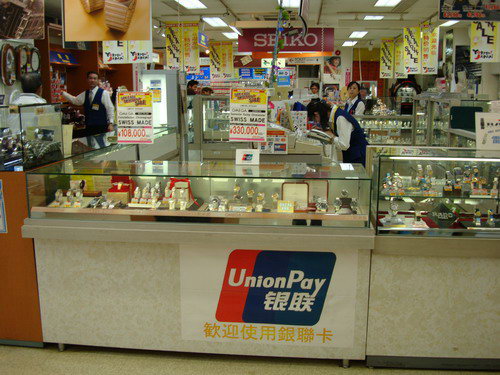 LAOX店內(nèi)的手表柜臺(tái),手表的種類多達(dá)數(shù)千款!足以滿足高、中、低端各個(gè)層次消費(fèi)者的需求,不過(guò)出于防損成本的考慮,大部分比較上檔次的商品只能采用傳統(tǒng)的柜臺(tái)銷售方式了,不過(guò)貼在柜臺(tái)前大大的銀聯(lián)字樣還是讓來(lái)自中國(guó)的我們感到了一絲親切(銀聯(lián)標(biāo)志在LAOX的店面外同樣有標(biāo)示)。