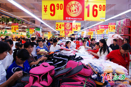 聯(lián)商網(wǎng)消息:醞釀了近2個月之久的步步高上饒店終于掀開了神秘的面紗,于9月29日正式開門迎客。據(jù)了解,上饒店位于上饒億升廣場負(fù)一樓,總占地14000平米,其中超市面積為11000平米,主要經(jīng)營生鮮、雜貨、針棉、家居、家電;美采平價(jià)百貨占地3000平米,主要經(jīng)營男裝、女裝、褲裝、童裝、針織衫、鞋類等。