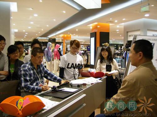 雖然今天是尚泰百貨開業(yè)日,但店內(nèi)并未見到打折促銷活動(dòng)。原來尚泰百貨實(shí)行的是會(huì)員折扣制,花10元即可辦理“紅卡”享受店內(nèi)正價(jià)商品95折,辦理金卡更有9折。因此,雖然不是免費(fèi)辦卡,但是辦卡的人數(shù)還是讓尚泰百貨的顧客服務(wù)部忙不過來,不得不的在其他樓層增設(shè)紅卡辦理服務(wù)區(qū)。除了會(huì)員專享折扣,尚泰百貨還針對(duì)每個(gè)樓層的特點(diǎn)進(jìn)行主題活動(dòng)。B1樓以潮人服飾為主,目標(biāo)為年輕的顧客群,因此設(shè)了專門的DJ打碟臺(tái),一樓的化妝品區(qū)邀請(qǐng)了專業(yè)化妝師免費(fèi)為顧客設(shè)計(jì)彩妝,三樓的嬰童用品區(qū)有專門供小孩子游戲的區(qū)域。除了百貨店自己推出的活動(dòng),尚泰百貨內(nèi)的品牌也有自己的活動(dòng),如來自德國(guó)的LAMY鋼筆請(qǐng)來大師為顧客現(xiàn)場(chǎng)用鋼筆速寫肖像。
