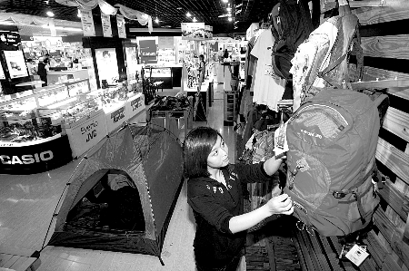 昨日,解放碑蘇寧電器商場,市民在選購戶外用品。歐陽祖兵 攝
