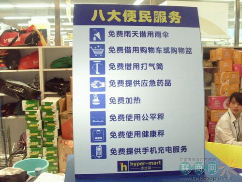 采用了全新的標(biāo)識HYPER MART,以藍(lán)色為主色調(diào),整個賣場設(shè)計簡潔時尚,十分注重細(xì)節(jié),VI協(xié)調(diào)統(tǒng)一。