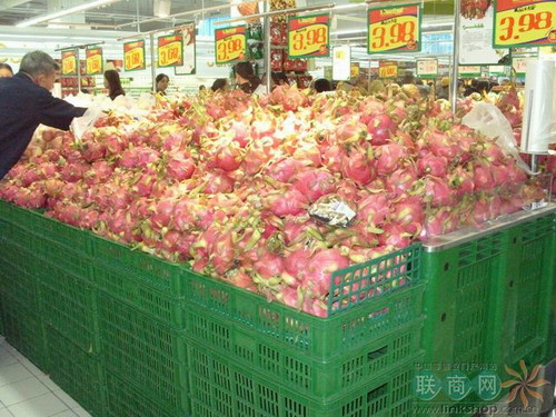 好多水果都采用了大面積陳列,貨架是綠色的塑料筐。
