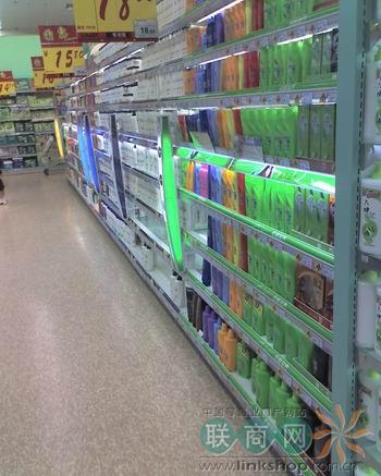 超市的一樓下地下一層的轉(zhuǎn)角處是化妝品形象專柜,面積不是很大,其它洗化用品都在地下食品區(qū)的一個死角,設計師想通過洗化區(qū)功能性產(chǎn)品的特性,引導顧客走完整個超市。在易買得超市的洗化區(qū)我沒有看到已往超市陳列洗發(fā)護膚的矮貨架,全部是2.2米左右的高貨架,在貨架上加了燈光照明,感覺不是很寬敞,過道有壓抑的感覺.
