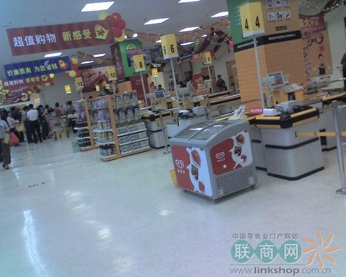 為了體驗一下韓國超市布局設計,我特意從一樓的超市正門進入超市,進門超市左邊是手機、數(shù)碼專柜和電視墻,右邊是一堵高高的促銷貨架,和大潤發(fā)入口設計一致;轉(zhuǎn)彎進入主通道,左邊是家用電器、辦公用品、家用百貨;右邊是鞋區(qū)、季節(jié)型服飾、一般性服飾;最靠墻位置是美特斯邦威和古今文胸等品牌的售賣區(qū),這種專賣店和商超的結(jié)合很不錯,美特斯邦威的裝修很簡潔,壁掛式貨架和層板組合搭配,和超市貨架很協(xié)調(diào),美中不足是在入口超市貨架和專賣區(qū)留了一條大的通道,使30%左右客流從這里到下食品區(qū)的電梯口,主通道的促銷品并沒有吸引到所有顧客按照設計動線流動。