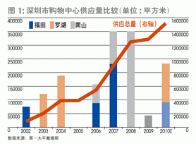 消費(fèi)需求的強(qiáng)勁增長,使得大批機(jī)構(gòu)和資金扎堆商業(yè)地產(chǎn),開發(fā)購物中心打造各式“商圈”。在這股潮流下,購物中心在中國一線城市的發(fā)展?jié)u趨飽和。以深圳為例,從2002-2008年,購物中心的供應(yīng)面積逐漸攀升(圖1),2009年有所放緩;在擴(kuò)展方向上,新增供給也從核心老城區(qū)羅湖、福田向南山這樣的新興商區(qū)擴(kuò)展。其他一線城市也面臨同樣的境況,開發(fā)商在商業(yè)地產(chǎn)上的圈地步伐逐漸放緩,開始大力向二線城市拓展。