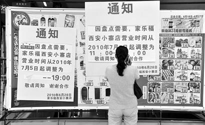家住城南客運(yùn)站附近的吳先生說,鄰居告訴他,由于家樂福要撤出西安,一直在進(jìn)行商品促銷。昨日上午11時(shí)20分,他趕到了家樂福小寨店,但沒有開門,到下午2時(shí)30分,該店還是沒有開門。