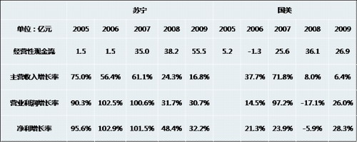 陳曉團(tuán)隊的第一張錯牌是業(yè)績牌。最新公布的財務(wù)報告顯示,國美經(jīng)營業(yè)績超出市場預(yù)期,陳曉團(tuán)隊試圖由此證明國美不需要黃光裕,但稍加分析即知國美業(yè)績下滑是過去5年的趨勢,導(dǎo)致2009年國美被迫大面積關(guān)店,使主要競爭對手蘇寧電器的店面數(shù)反超國美。國金證券零售業(yè)研究員文瑤提供的數(shù)據(jù)表明,國美蘇寧兩大零售業(yè)巨頭的經(jīng)營性現(xiàn)金流和利潤的增長速度在過去5年都在下降,但相對而言,蘇寧的業(yè)績增長大幅度超越國美。