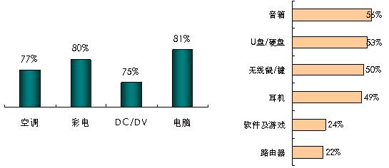 五星消費(fèi)調(diào)研還顯示,除了主商品外,現(xiàn)在消費(fèi)者配件需求越來(lái)越大,也希望“一站式”購(gòu)齊相關(guān)配件。其中空調(diào)、彩電、DC/DV和電腦四品類(lèi)的配件需求最旺盛。電腦的附件需求率最高,占比達(dá)81%;彩電附件需求率也達(dá)到80%;排名三、四的空調(diào)和DC/DV也都在75%以上。電腦附件中,音箱和U盤(pán)/硬盤(pán)的需求較高,其次為無(wú)線鍵鼠和耳機(jī)。彩電附件中,42%是消費(fèi)者需要購(gòu)買(mǎi)電視底座,其次為電視掛架、機(jī)頂盒和AV線材?照{(diào)附件中,空調(diào)機(jī)罩占比居首,后依次為:空氣凈化器、空調(diào)過(guò)濾網(wǎng)清潔劑和加濕器。DC/DV中,排行首位的是存儲(chǔ)卡,其次為電池、充電器、讀卡器、膜/套、包。這次五星十一采購(gòu)的配件將達(dá)到千余個(gè)型號(hào),覆蓋所有家電品類(lèi),為歷次黃金周最大規(guī)模。