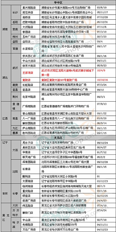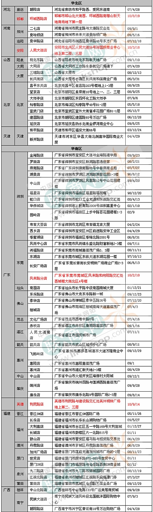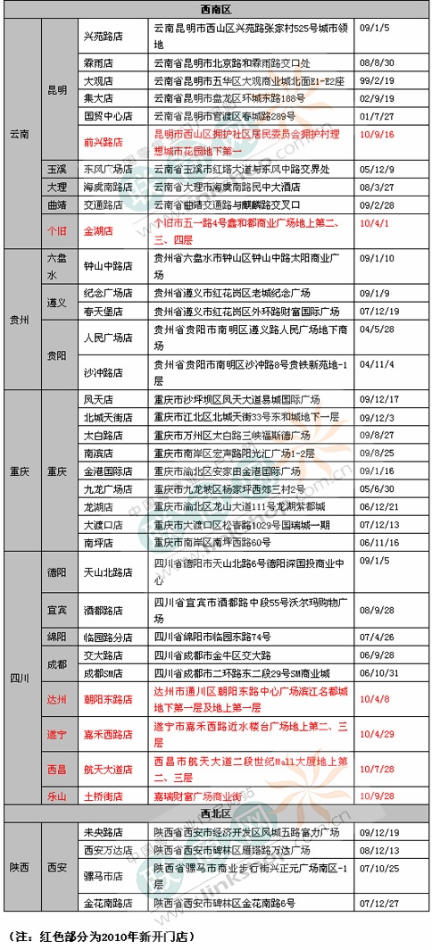 下圖為沃爾瑪2010年前三季度中國(guó)內(nèi)地新開(kāi)門(mén)店一覽表,本表門(mén)店截止日期為10月22日。