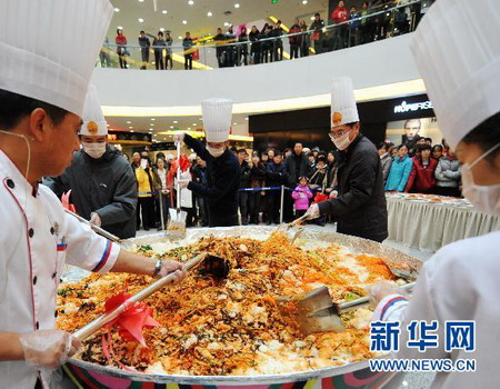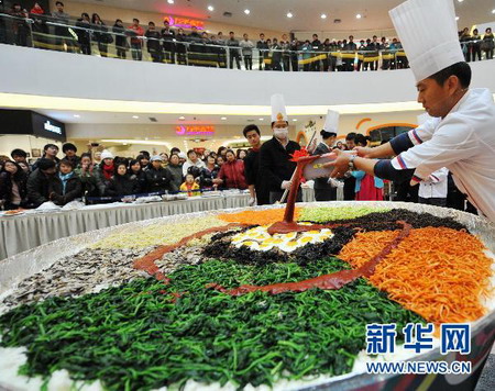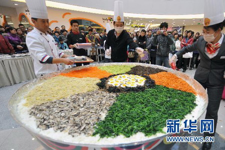 巨型韓國石鍋拌飯亮相長春萬達廣場 來源: 聯(lián)商網(wǎng) 2010-11-14 09:14 當日,一道直徑2米的韓式料理石鍋拌飯現(xiàn)身長春市萬達購物廣場,吸引了商場內(nèi)數(shù)百名購物者駐足觀賞和品嘗。據(jù)介紹,這道石鍋拌飯的原料包括150斤大米和50斤胡蘿卜、西葫蘆等蔬菜,耗時近一天烹制而成。 。ㄐ氯A社記者林宏攝)