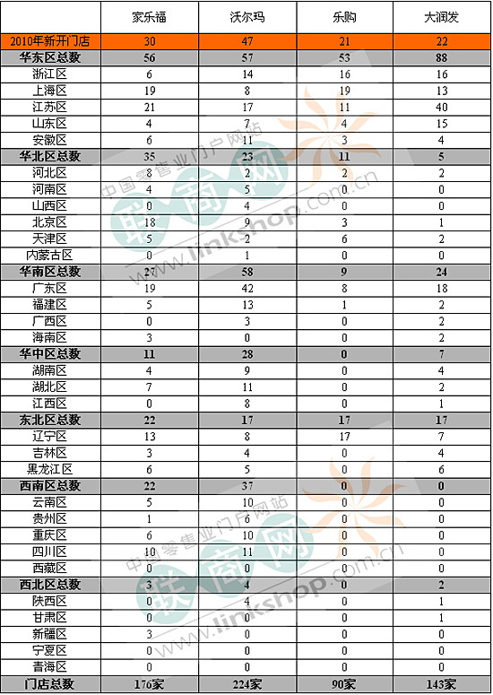 家樂福、沃爾瑪、樂購、大潤發(fā)再華門店分布對比統(tǒng)計。
