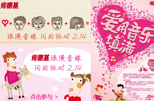 肯德基在某網站開展“浪漫音緣,閃約派對”活動,要參加的網友先在自己手機上下載任意一首指定歌曲。然后在2月14日情人節(jié)當天,前往任意一家KFC餐廳,在不同時段暫停背景音樂時,用手機與所有有緣人一起在指定時間播放同一首歌,用音樂填滿這段愛的空白。有意思的創(chuàng)意自然得到網友紛紛響應,不論是形單影只還是出雙入對,那時都可感受到同一曲浪漫。不知道屆時肯德基各門店的互動情況會怎樣,畢竟咱國人還是羞澀的多。