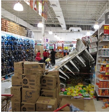 5月21日上午9時(shí)15分許,徐匯區(qū)船廠路上的卜蜂蓮花超市船廠店發(fā)生險(xiǎn)情,一個(gè)近20米長、3米高的貨架突然倒塌,致使購物通道內(nèi)的數(shù)名顧客及店員被壓,其中一名老太傷勢較重,腿部骨折。