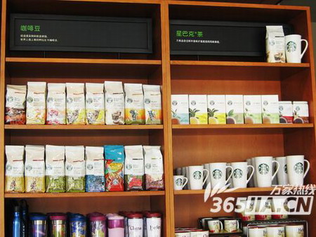 星巴克店內(nèi)貨架上擺放很多咖啡茶原料和特色咖啡杯