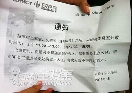 按照店長要求,從8月16號(hào)開始,促銷員休息室開放時(shí)間為:上午11:00—13:00;下午17:00—19:00。上班期間,促銷員不得隨便到辦公區(qū),如有需要上辦公區(qū),請(qǐng)?jiān)?F員工通道保安處換取出入證,每次人數(shù)不得超過15人。落款是”雙橋店人事部“。