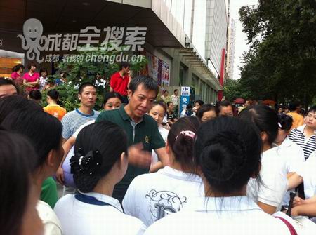 促銷員拒絕上班,并在空壩內(nèi)聚集。3時(shí)許,雙橋子家樂福店長兩次來到現(xiàn)場,拿著擴(kuò)音器對(duì)大家說道,請(qǐng)大家有意見可以提,最好坐下來談,通過拒絕上班的方式解決不了問題。