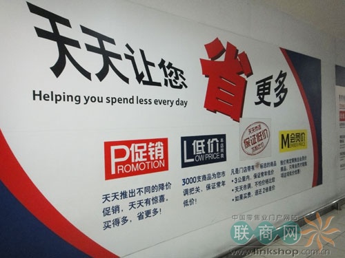 商場(chǎng)入口處,包括出口過道都有大幅的廣告宣傳自己的自有產(chǎn)品,并附有文字說明:“我們?nèi)碌淖杂衅放粕唐?品質(zhì)保證 價(jià)格實(shí)惠 精選百余種日常所需商品 保證商品優(yōu)質(zhì)安全 保證全年低價(jià)供應(yīng)”。