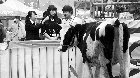 不過,這并不影響消費者的熱情。昨天,面對消費者的圍觀,兩頭“哞哞”表情淡定,并不時賣萌“配合”大家拍照。