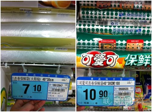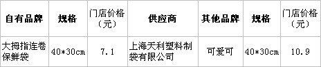 分析:同樣規(guī)格的保鮮袋,“可愛(ài)可”品牌的卻比“大拇指”高出3.8元,不知消費(fèi)者會(huì)作何選擇?