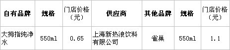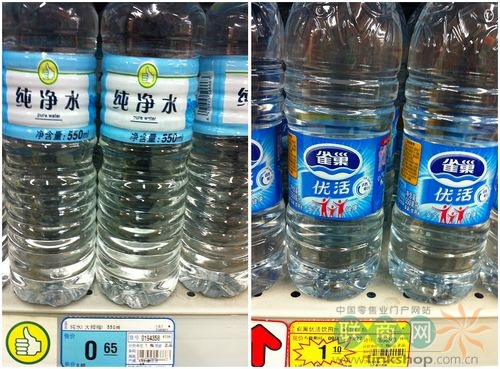 分析:550ML“大拇指”純凈水 VS 550ML“雀巢”優(yōu)活,差價(jià)接近一半。
