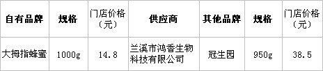 分析:1KG“大拇指”蜂蜜與950G冠生園相比較而言,規(guī)格上“大拇指”多50G,價(jià)格上冠生園反而高出23.7,是產(chǎn)品對(duì)照組差價(jià)比較明顯的一組。