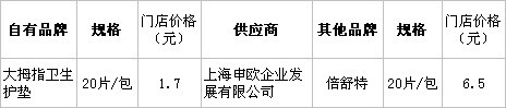 分析:20片/包衛(wèi)生護(hù)墊,“倍舒特”價(jià)格是“大拇指”的3倍,可想而知,“大拇指”產(chǎn)品相當(dāng)劃算。