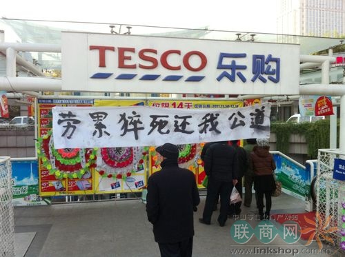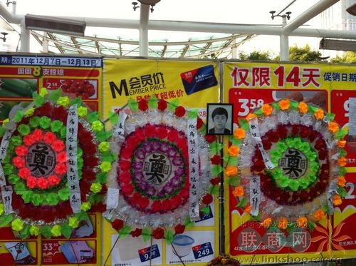 聯(lián)商網(wǎng)快訊:2011年12月11日,今天中午12點(diǎn)左右,聯(lián)商網(wǎng)小編路過(guò)杭州樂(lè)購(gòu)超市河濱店(建國(guó)北路471號(hào)),發(fā)現(xiàn)超市入口處,放置著5、6個(gè)大花圈,并掛有寫著“勞累猝死還我公道”、“樂(lè)購(gòu)超市沒(méi)有人性”的白色橫幅。引起了不少過(guò)往的行人,附近小區(qū)居民,前來(lái)樂(lè)購(gòu)購(gòu)物的消費(fèi)者的圍觀議論,難道樂(lè)購(gòu)超市河濱店出事情了?員工勞累猝死?