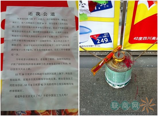 據(jù)悉,該事件電視媒體、報(bào)刊都相繼有報(bào)道過(guò)。但是樂(lè)購(gòu)方還是強(qiáng)行以“該員工用假身份證”為由拒絕給死者饒光強(qiáng)家屬一個(gè)交待。才導(dǎo)致死者家屬將死者相片、橫幅、以及花圈放置在樂(lè)購(gòu)超市入口處。