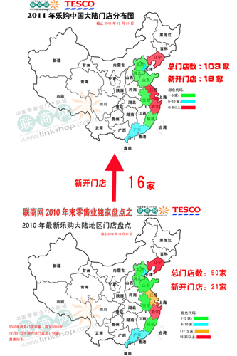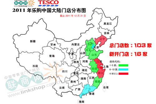 聯(lián)商網(wǎng)綜合統(tǒng)計:截止2011年12月31日,TESCO樂購在中國的門店總數(shù)已達103家(11省/直轄市,46個城市,包括1家Extra樂購天地),其中52家全新節(jié)能店(不包括Extra),分布于上海、北京、天津、沈陽、杭州、廣州、深圳等46個城市,主要覆蓋華北(包括北京和天津)、華東(包括上海)及華南(包括廣州)三大區(qū)域。