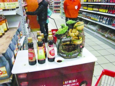 在遼寧鞍山站前一家超市的調(diào)料區(qū),促銷桌上的醬油盆景引來不少市民。不少市民聽了促銷員的講解后,都買上一兩瓶。促銷員劉女士說,這是按照廠家的要求昨天擺出來的,目的是直觀地向顧客展示醬油的色澤和味道,盆景旁邊的七八瓶醬油都是可以讓顧客品嘗的。
