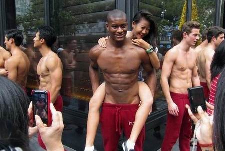 2011年12月14日,在新加坡一家商場外,一名女子和赤膊的男模合影。當(dāng)日,Abercrombie & Fitch在新加坡的旗艦店開張,為吸引顧客,商家找來多名肌肉發(fā)達、年輕帥氣的男模赤膊上陣,招攬生意。