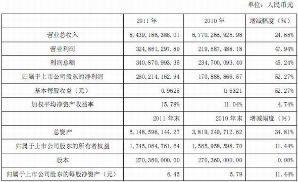 2011年公司在經(jīng)營(yíng)管理及業(yè)績(jī)?cè)鲩L(zhǎng)方面都取得了較好的成績(jī),很好的完成業(yè)績(jī)指標(biāo)。報(bào)告期期末總資產(chǎn)51.49億元,較年初增長(zhǎng)34.81%,報(bào)告期營(yíng)業(yè)收入84.39億元,同比增長(zhǎng)24.65%,凈利潤(rùn)2.60億元,同比增長(zhǎng)52.27%,每股收益為0.9625元,同比增加0.3304元。