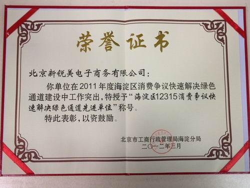 據(jù)了解,在2011年度北京市海淀區(qū)消費爭議快速解決綠色通道建設(shè)中, 國美電器網(wǎng)上榮獲“海淀區(qū)12315消費爭議快速解決綠色通道先進(jìn)單位”稱號,主辦方對國美網(wǎng)上商城的良好服務(wù)和誠信經(jīng)營給予了高度肯定。