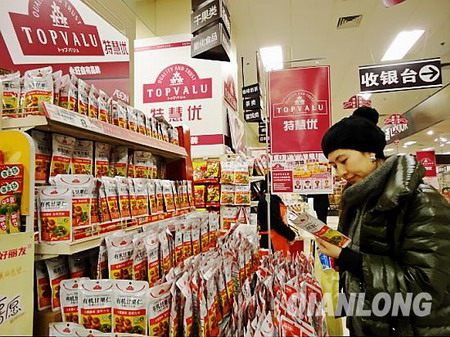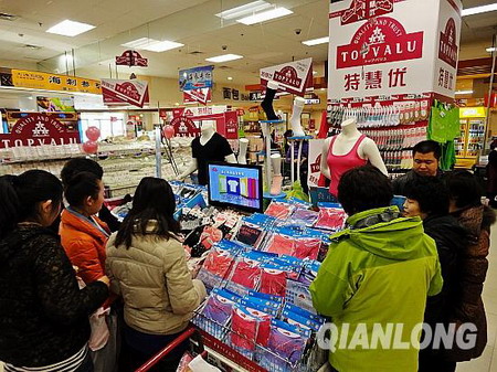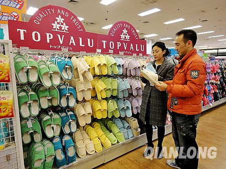 記者昨天在位于昌平的永旺店看到,持有“特慧優(yōu)”標(biāo)志的花生油、果凍、甘栗以及符合與中國住宅情況相符的厚底拖鞋、襪子等115種生活基本用品已經(jīng)開始在店里銷售。這標(biāo)志著從昨天起,永旺正式在中國大陸61家店鋪同時發(fā)售自有品牌“TOPVALU”(特慧優(yōu))商品。“TOPVALU ”商品將比同質(zhì)商品的價格優(yōu)惠20%左右。據(jù)悉,預(yù)計9月還將推出時裝類商品,年內(nèi)力爭自有商品種類擴(kuò)大至500個品種。2013年擴(kuò)充至1000個品種。