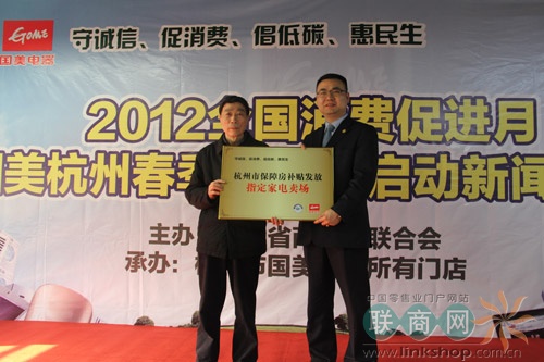 發(fā)布會最后浙江省商貿(mào)業(yè)聯(lián)合會會長吳德隆向浙江國美電器有限公司授予了“杭州市保障房補(bǔ)貼發(fā)放指定家電賣場”的牌匾,浙江國美電器有限公司總經(jīng)理唐曉曦鄭重承諾,將全力保障活動的順利進(jìn)行,盡心為消費(fèi)者服務(wù)。