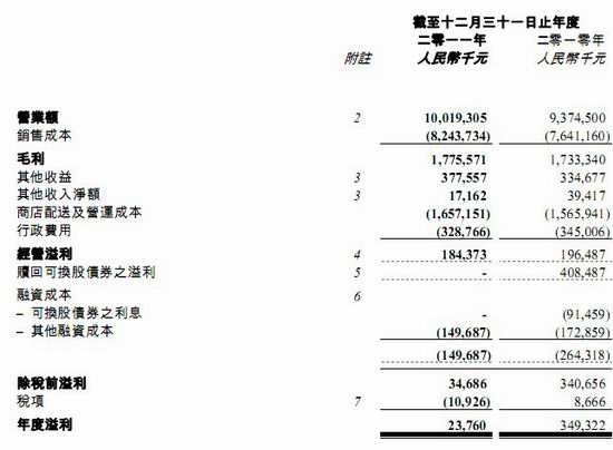 去年由于通脹加速導(dǎo)致銷售成本上升、增加去庫存促銷活動(dòng)等原因,導(dǎo)致毛利率由2010年的19.6%微降至19.3%,跌0.3個(gè)百分點(diǎn);溢利下降也是受到毛利率負(fù)增長(zhǎng)的影響。