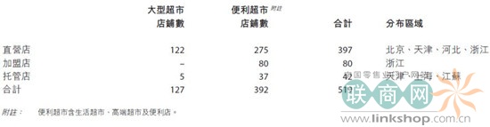 物美商業(yè)表示,截至2011年12月31日止,集團及其聯(lián)營公司(北京超市發(fā)連鎖有限公司“超市發(fā)”除外)、合營企業(yè)直接經(jīng)營及通過訂立《特許經(jīng)營協(xié)議》《委托和經(jīng)營和管理協(xié)議》經(jīng)營與管理的零售網(wǎng)絡(luò)共519間(2010年12月31日:492間),其中大型超市127間,便利超市392間,總銷售面積達667,095.5 平方米(未包含聯(lián)營公司店鋪、加盟店)。