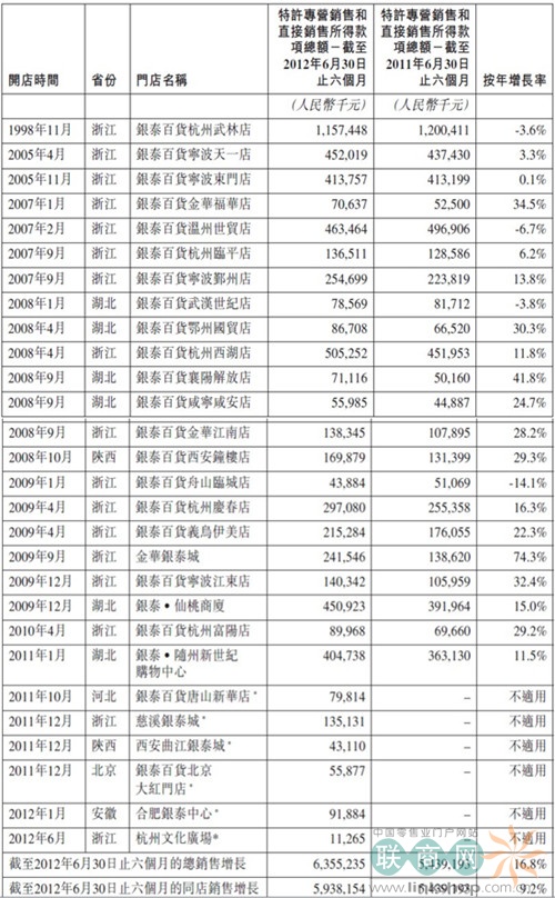 銀泰百貨截至2012年6月30日止六個月的營運統(tǒng)計數(shù)字(未經(jīng)審計):