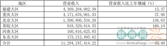 永輝超市上半年綜合毛利率18.98%,同比下降0.13%.,主要是由于主營業(yè)務(wù)毛利率下降0.47%所致。福建大區(qū)、重慶大區(qū)和蘇皖大區(qū)的主營業(yè)務(wù)毛利率分別上升0.14%、0.11%、0.86%,新設(shè)的河南大區(qū)、東北大區(qū)以及北京大區(qū)轄內(nèi)的新開店主營業(yè)務(wù)毛利率拖累了公司上半年的綜合毛利率。福建大區(qū)和重慶大區(qū)的收入占比繼續(xù)下降,其它地區(qū)均有不同程度的上升。