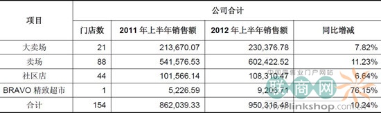 聯(lián)商網(wǎng)消息:永輝超市周一晚間公布半年報稱,2012年上半年實現(xiàn)營業(yè)收入117億元,同比增長45.89%,增速比上年同期加快1.94%,高于全國同行業(yè)平均水平。凈利潤1.92億元,同比下降28.76%。