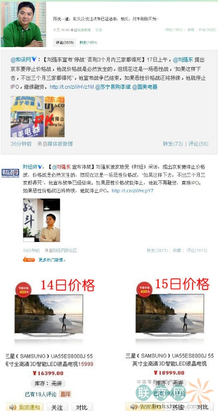 聯(lián)商網(wǎng)消息:8月17日,國(guó)美電器正式啟動(dòng)全國(guó)1700多家門店“擊破網(wǎng)價(jià)”行動(dòng),僅一天時(shí)間,京東商城CEO劉強(qiáng)東在接受《財(cái)經(jīng)》雜志采訪時(shí)提出,“京東要停止價(jià)格戰(zhàn),價(jià)格戰(zhàn)是必然發(fā)生的,但現(xiàn)在這是一場(chǎng)惡性價(jià)格戰(zhàn),如果這樣下去,不出三個(gè)月,三家都得死”。他宣布戰(zhàn)爭(zhēng)已經(jīng)結(jié)束。