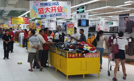 顧客在新開(kāi)業(yè)的樂(lè)購(gòu)泉州寶洲店內(nèi)選購(gòu)商品