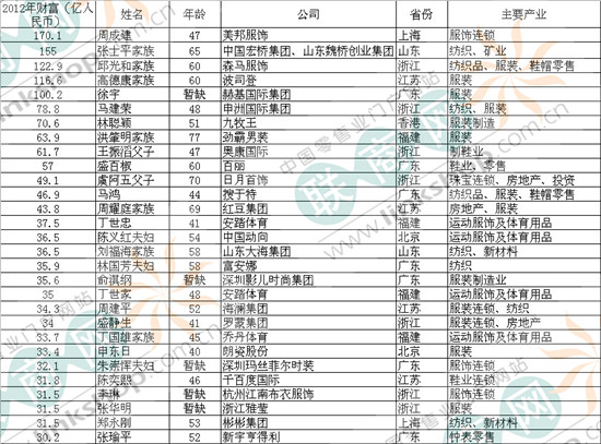 附表:2012福布斯中國富豪榜紡織服裝類榜單