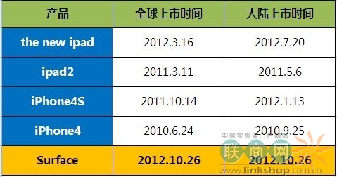 這一消息的證實無形中打破了全球科技產(chǎn)品登陸中國大陸必遲到的慣例。以蘋果的系列產(chǎn)品為例(見下圖),從iPhone4、iPhone4S,再到ipad2 、the new ipad,無一不是大陸上市時間要晚于全球首批上市時間,the new ipad甚至遲到了4個多月。而此次Surface上市,中國大陸卻出乎意料地取得了全球同步發(fā)售權(quán)。